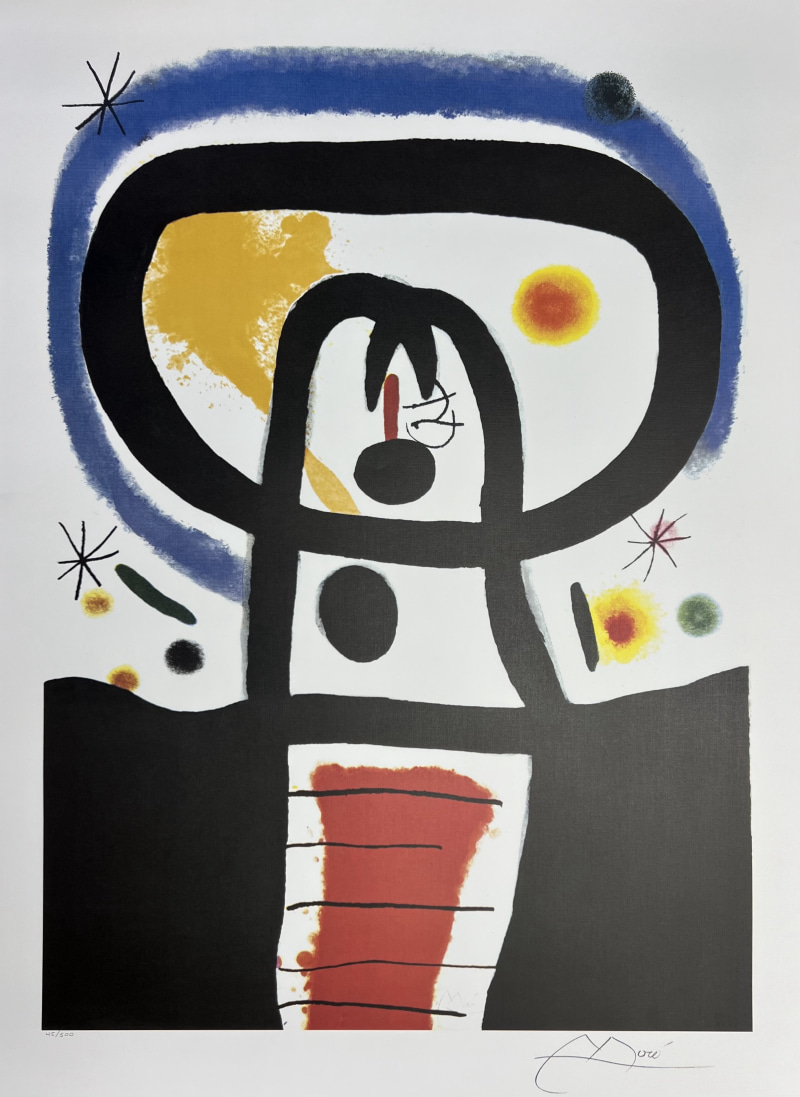 “Equinox,” a vibrant lithograph created by the renowned artist Joan Miró in 1983, is a testament to his mastery of color, form, and symbolism. Miró, a pioneering figure of Surrealism, imbues this artwork with a sense of whimsy and enigma, inviting viewers into a world of imagination and possibility. In “Equinox,” Miró’s distinctive style is on full display, characterized by bold, expressive lines and vivid, saturated colors. The composition pulsates with energy, as geometric shapes, and organic forms dance across the surface of the print, creating a dynamic interplay of contrasts and harmonies. At the heart of the composition lies a celestial motif, evoking the cyclical nature of time and the eternal rhythm of the universe. Miró’s use of symbolic imagery—such as stars, moons, and celestial bodies—adds layers of meaning to the artwork, inviting viewers to contemplate themes of cosmic harmony and cosmic equilibrium. The title “Equinox” further reinforces the artwork’s connection to celestial phenomena, suggesting a moment of balance and transition between light and darkness, day and night.