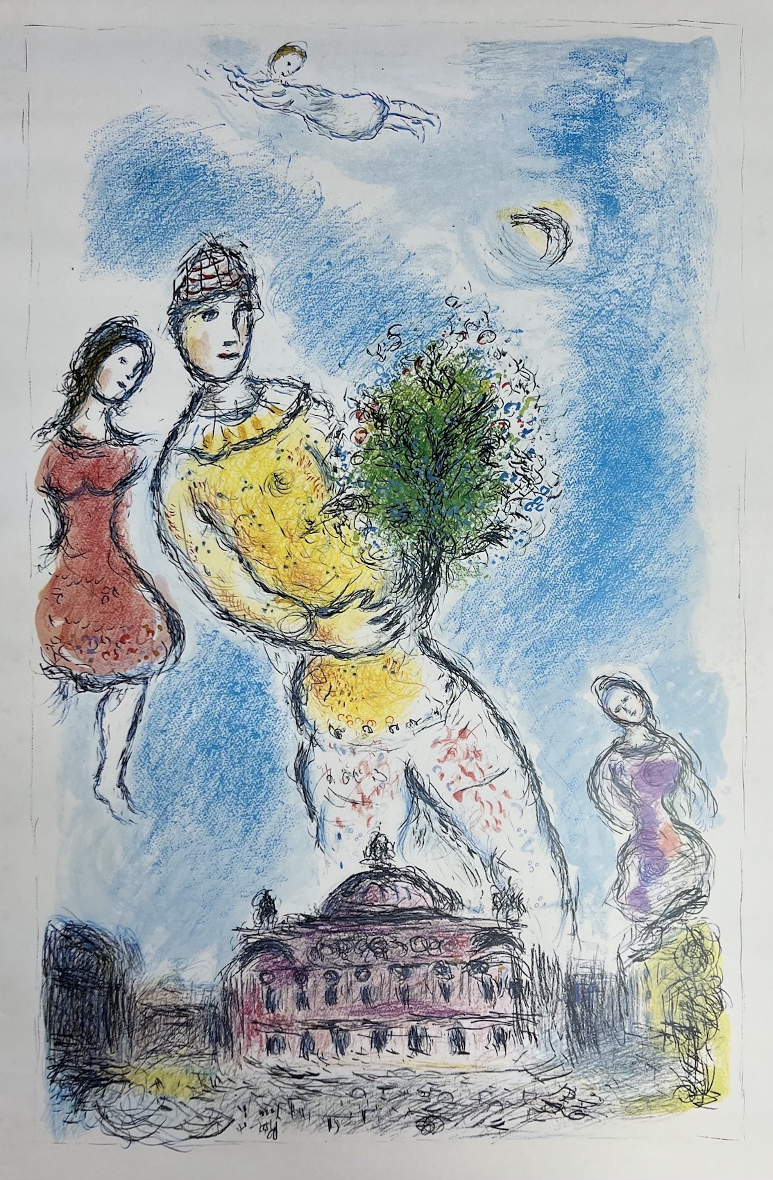 Marc Chagall’s “Dans le ciel de L’Opera” (In the Sky of the Opera), created in 1981, is a captivating example of the artist’s dreamlike interpretation of the world. In this enchanting composition, Chagall invites viewers into a whimsical realm where reality and fantasy merge seamlessly. The scene depicts a colorful and lively interpretation of the Paris Opera House, with its iconic architecture rendered in Chagall’s distinctive style. Ethereal figures, including dancers and musicians, float gracefully amidst billowing clouds and celestial bodies, creating a sense of enchantment and wonder. Chagall’s use of vibrant colors and swirling forms infuses the artwork with a sense of joy and dynamism, evoking the spirit of music and performance that permeates the opera house. Through his poetic vision, Chagall invites viewers to experience the magic of the theater and the transcendent power of art.