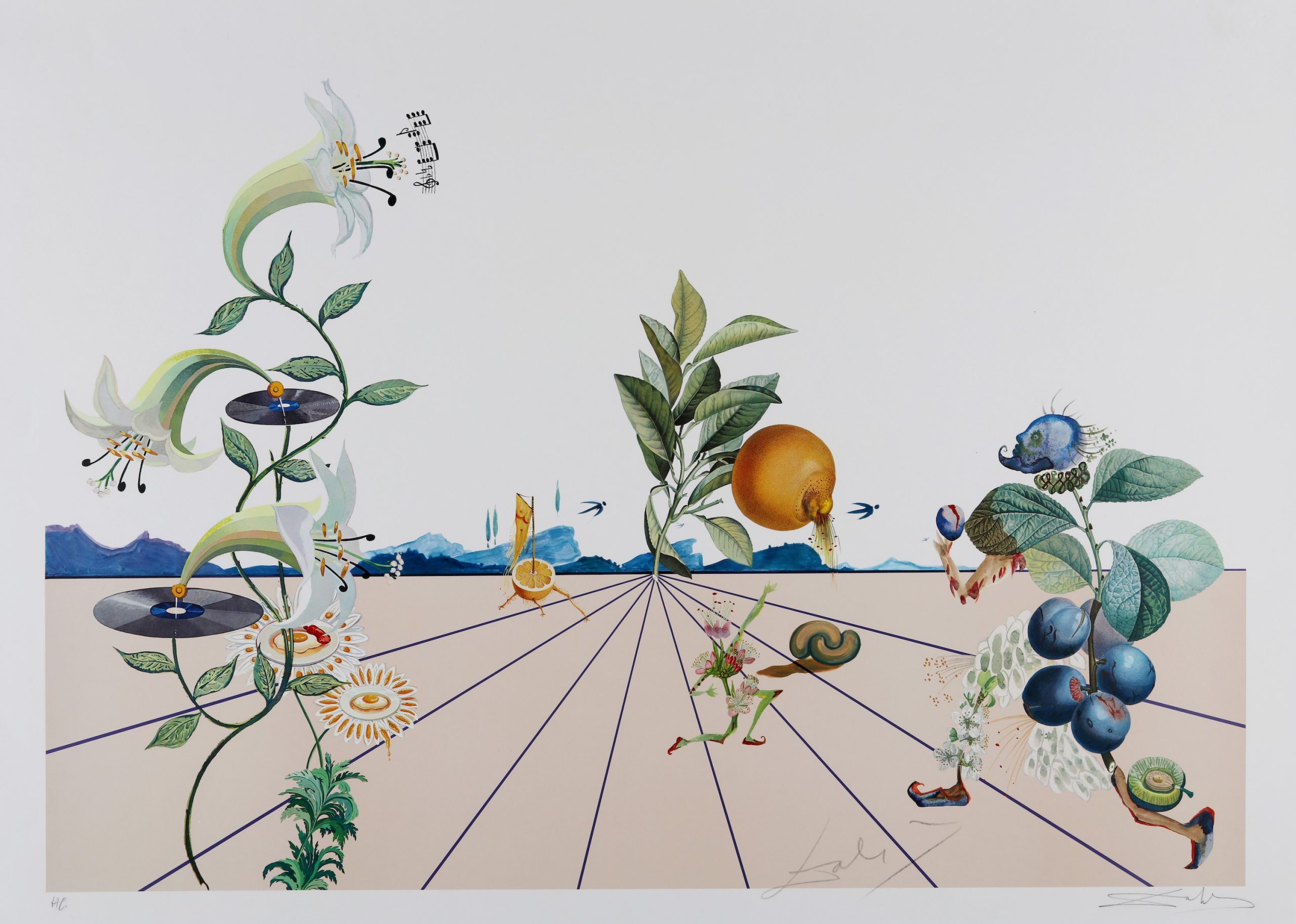 In Flordali I and Flordali II, Salvador Dalí brings his Surrealist imagination to the natural world, focusing on the beauty and the symbolic power of flowers. Created in 1981, this series is a vibrant exploration of botanical forms, utilizing the medium of lithography and the technique of embossing to add both visual and tactile depth. Specifically, Dalí’s intricate use of embossing gives the prints a three-dimensional quality, bringing the flowers to life in a surreal, dreamlike manner. The wordplay in the series title adds another layer of meaning, merging flor (the Spanish word for flower) with Dalí’s own name, thereby suggesting that the flowers are extensions of his identity and creativity.