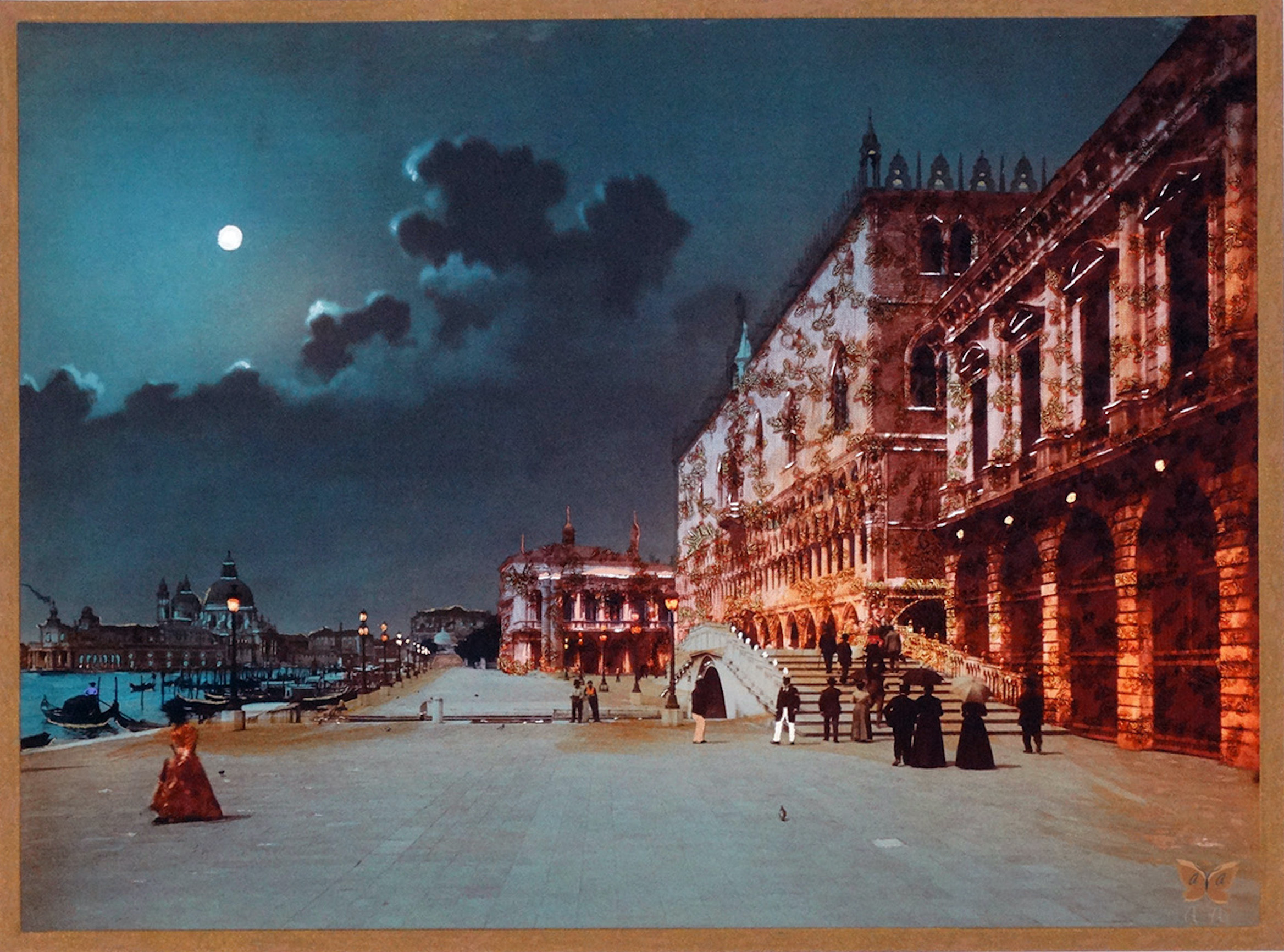 For centuries the grandeur of Venice thrives by the ceremonial customs that casts a spell on itself. The decorative veiling of venetian buildings is a sacred ritual that has symbolic weight. It does this by maintaining relationships of symbol upon symbol. Put away all the symbols and what are you left with? Little imagination that produces ordinary buildings. This statement print does the honor by upholding this venetian practice of grandeur that brings joy. See the Piazza in San Marco, it is adorned with an indian Sari. The indian custom of adoration called Shringar is the adornment of oneself. Shringar is repurposed in a pageantry that is India consecrating Venice. Hey presto! It’s now an even more marvelous building that feels and looks like a temple of a goddess. See Shringar take hold of the female walking toward us in the foreground. Take note how gouache is used to highlight the most minuscule of details.